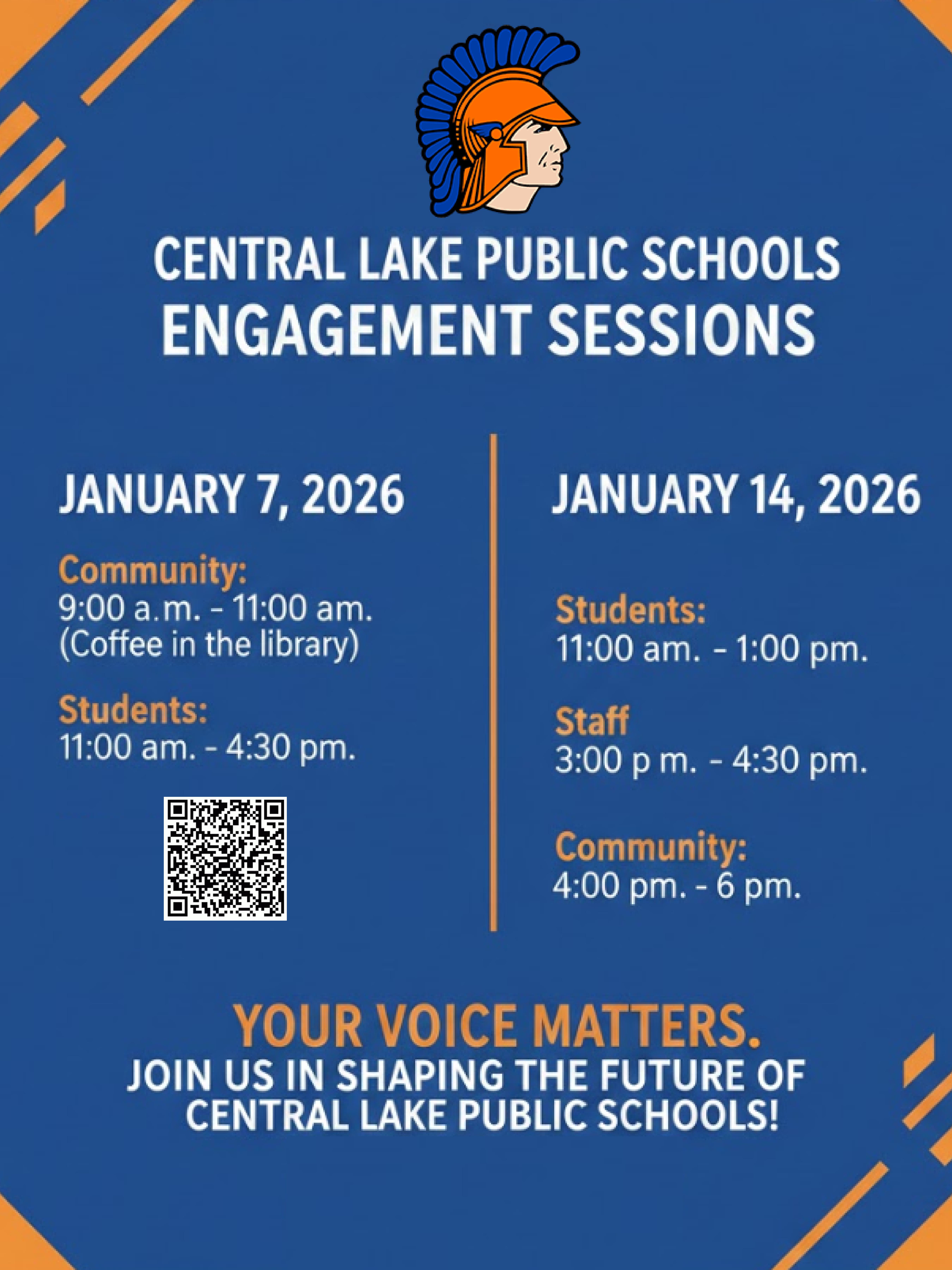 The Board of Education and the Administration are launching a new initiative to guide Central Lake Public Schools through a Three- to Five-Year Strategic Plan. The purpose of this initiative is to help develop new goals and strategies to continue offering an excellent education to our students while using scarce public education resources as effectively and efficiently as possible. The strategic planning process is designed to produce approximately five goals to be accomplished over a three- to five-year period. The plan uses data, along with feedback from staff, students, and community members, to create a shared vision for the future that will make the district an even better place for our students. Your ideas about the strengths of Central Lake Public Schools are very important, as are your opinions on where there is opportunity to remove barriers to implementation and other input. Therefore, you are invited to provide input in either of the scheduled face-to-face sessions or electronically (QR code included on the flyer). All input must be received by January 31, 2026.