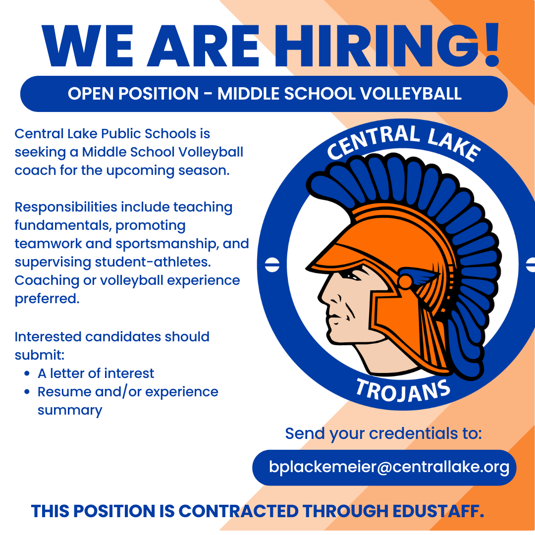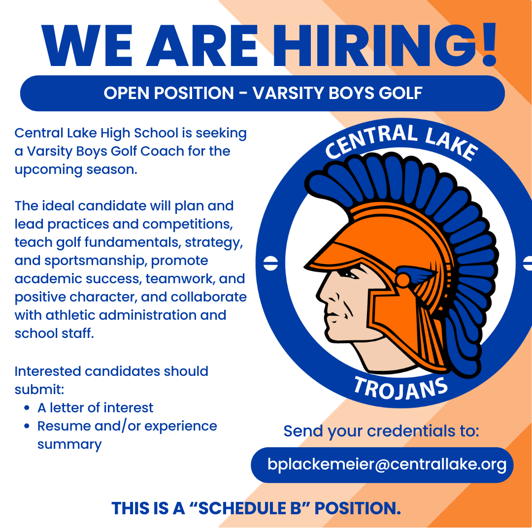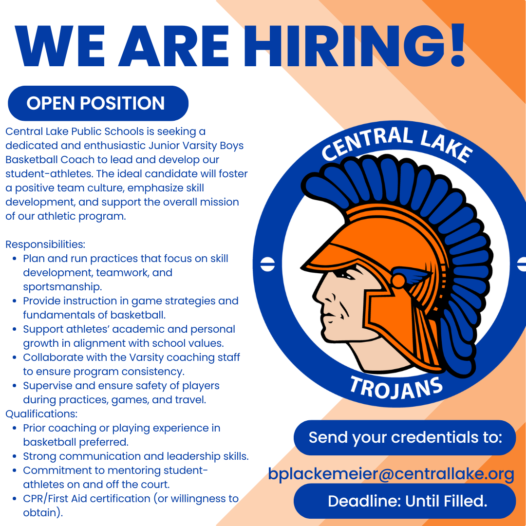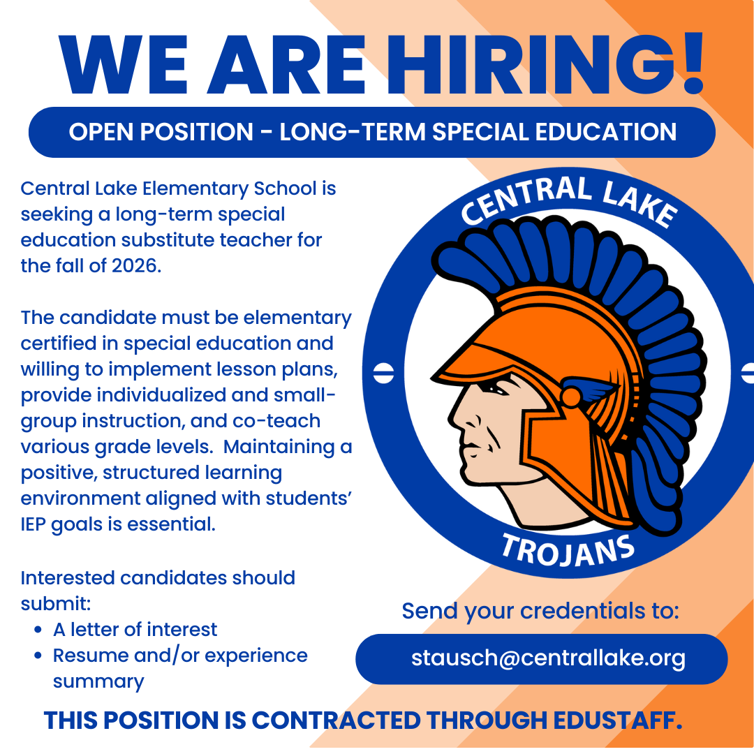 Central Lake Public Schools is an Equal Opportunity Employer. It does not discriminate on the basis of race, creed, color, religion, sex, national or ethnic origin, age, disability, or handicap in its educational programs, activities, services, or employment practices.