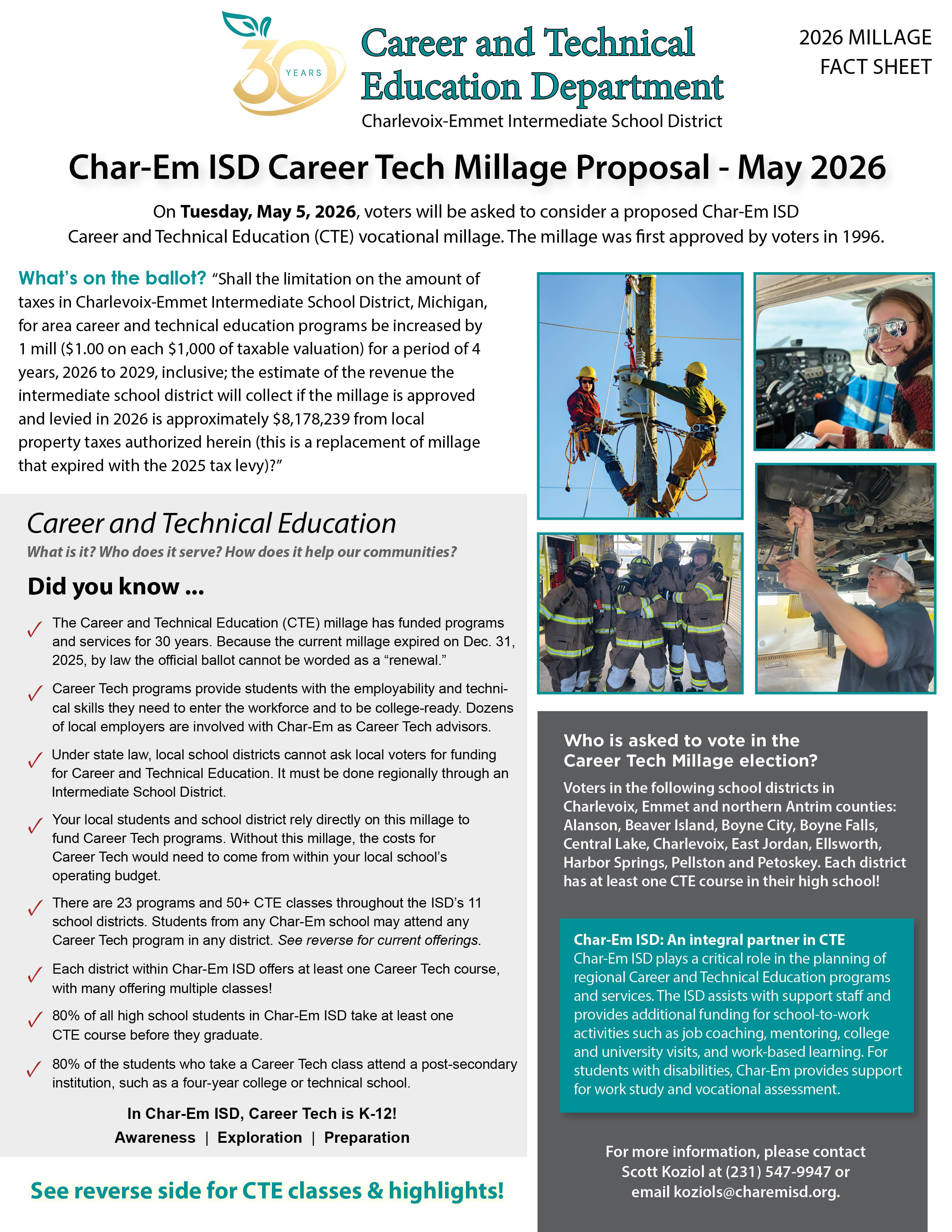 On May 5, 2026, voters in Charlevoix, Emmet, and northern Antrim Counties will be asked to vote on Char-Em ISD's Career and Technical Education millage. This millage has supported career and technical education and initiatives for 30 years, since it was first approved by voters in 1996.